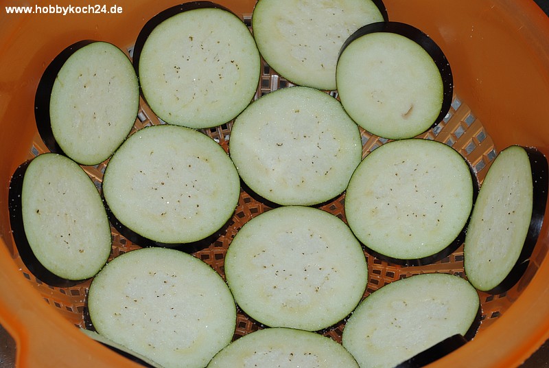 Die Auberginen waschen, trocken reiben und in etwa 7mm dicke Scheiben schneiden. Die Auberginenscheiben gut salzen und in einem Sieb oder auf einem Ofengitter etwa eine Std. lang zum Abtropfen auslegen.