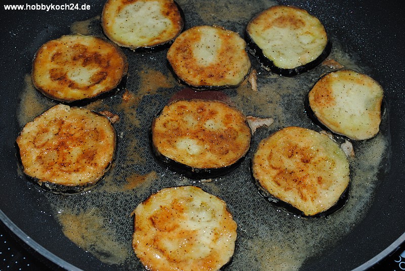 Die Auberginenscheiben von beiden Seiten in dem Mehl wenden und in einer Pfanne mit heißem Pflanzenöl portionsweise von jeder Seite Anbraten, bis Sie schön braun sind. Anschließend auf einem mit etwas Küchenkrepp ausgelegten Teller kurz abtropfen lassen.