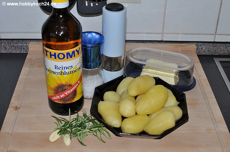 Rezept für gebratene Kartoffeln. Gekochte Kartoffeln, die mit Knoblauch, Rosmarin und Butter angebraten werden. Einfach und preiswert.