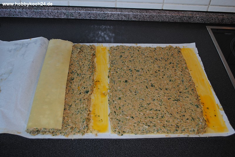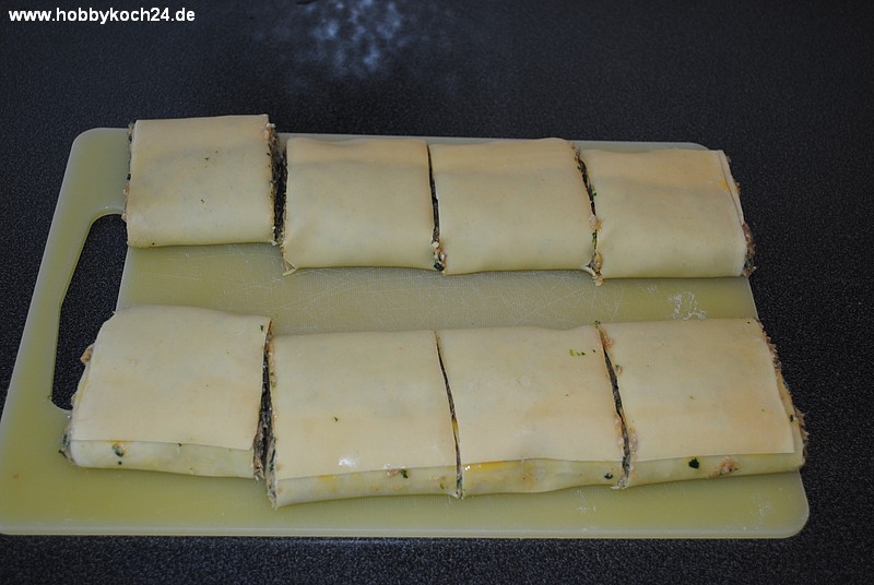 Den Nudelteig ausrollen und in 25cm breite Streifen schneiden. Den Nudelteig etwa 0,5-1 cm dick mit dem Brät bestreichen. Dabei an der rechten Seite etwa 3-4 cm freilassen. Den freigelassen Nudelteig mit Eigelb bestreichen. Nun den bestrichenen Nudelteig von der linken Seite etwa 8cm einschlagen und etwas andrücken. Den Teig weiter aufrollen und das Teigende mit dem Eigelb gut festdrücken. Die Rolle nun längs in 4 gleichgroße Stücke schneiden.
