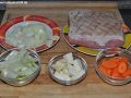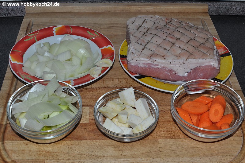 Den Schweinebraten waschen und trocken tupfen. Die Schwarte mit einem sehr scharfen Messer (oder Teppichmesser) rautenförmig bis zu der Fettschicht einschneiden. Dabei aufpassen, dass man nicht bis zum Fleisch einschneidet. Die Schwarte mit frisch gemahlenem Pfeffer und dem Kümmel einreiben. Die Zwiebel schälen, halbieren und in grobe Würfel schneiden. Die Karotten schälen, Enden entfernen und in grobe Stücke schneiden. Den Lauch putzen und in ca. 2cm breite Streifen schneiden. Von der Knollensellerie die äußeren Ränder abschneiden und den Rest in grobe Würfel schneiden. Die Knoblauchzehe schälen und klein schneiden. Falls nötig, die Gemüsebrühe zubereiten.
