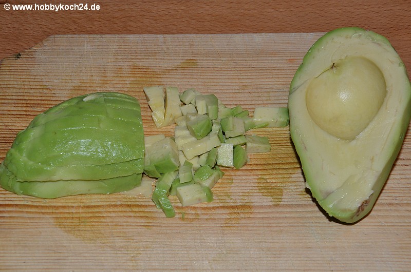 Das Tramezzinibrot der Breite nach halbieren. Die Limette halbieren und auspressen. Die Avocados halbieren, entsteinen, schälen und anschließend in kleine Würfel schneiden. Die Avocadostücke mit dem Limettensaft beträufeln, damit sich die Avocado nicht verfärbt. Die Creme fraiche und den Frischkäse abwiegen.