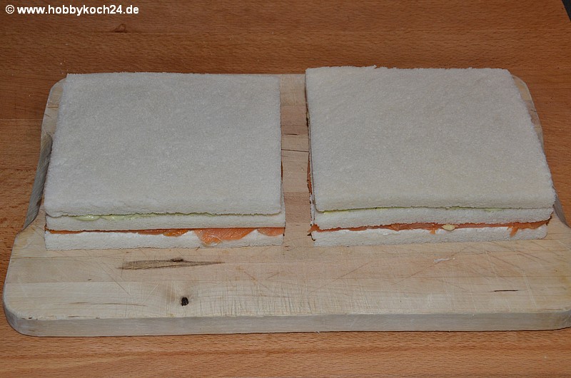 Zwei Scheiben Tramezzinibrot mit Frischkäse bestreichen und mit Lachs belegen. Diese jeweils mit einer zweiten Scheibe Brot belegen, die Avocadomasse darauf verteilen und mit einer weiteren Scheibe Brot bedecken. Die Brotscheiben gut andrücken und die Sandwiches diagonal durchneiden, so dass Dreiecke entstehen.