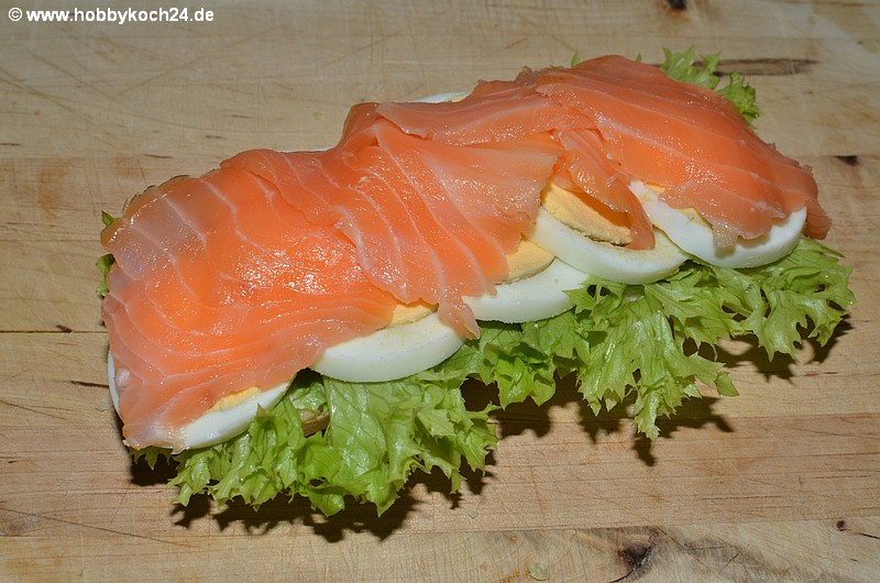 Die Unterseiten mit einem großen Salatblatt belegen. Darauf ein gekochtes Ei in Scheiben verteilen. Diese mit 1-2 Scheiben Räucherlachs belegen und mit der Baguetteoberseite abdecken.