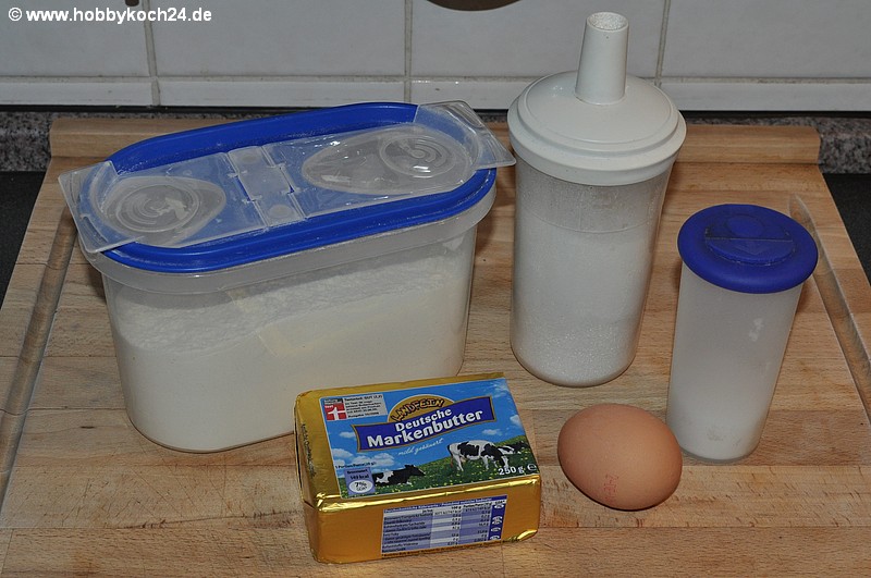 Mehl, Zucker und Butter abwiegen. Das Ei aufschlagen.