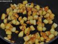 In einer großen Bratpfanne das Pflanzenöl erhitzen und darin die Kartoffelwürfel kurz scharf anbraten. Anschließend die Hitze etwas zurücknehmen und die Kartoffeln zugedeckt braten, bis sie fast fertig sind.
