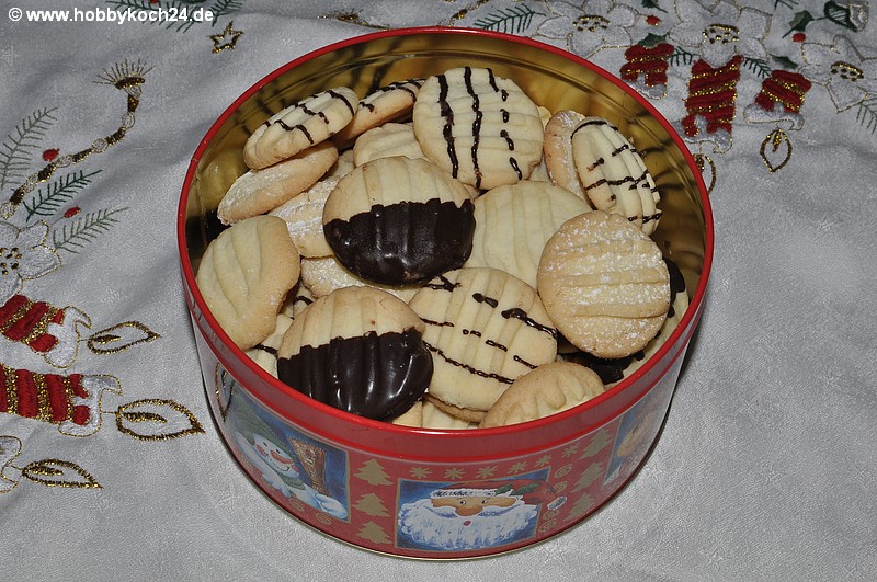 Nach dem Abkühlen kann man die Plätzchen mit etwas Puderzucker bestäuben oder mit Kuvertüre verzieren.