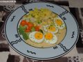 Die Eier kann man auch aufschneiden. Beim Anrichten alles mit etwas frischer Petersilie oder frischem Schnittlauch bestreuen.