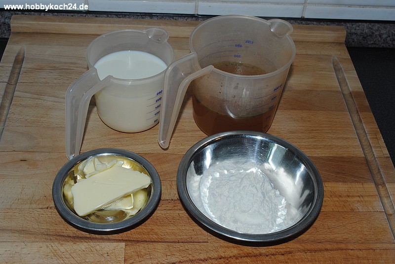 Mehl abwiegen. Milch abmessen. Gemüsebrühe zubereiten.