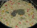 In einem Topf oder einer Pfanne etwas Pflanzenöl erhitzen und darin die Zwiebelwürfel andünsten. Nach ca. 5 Minuten den Knoblauch dazupressen und die Paprikawürfel dazugeben. Nach weiteren 5 Minuten die Zucchiniwürfel dazugeben und kurz mit andünsten. Dabei mit 1 TL Salz und 1/2 Tl Pfeffer würzen.