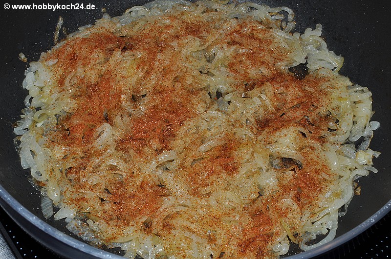 In einer Bratpfanne das Pflanzenöl mit der Butter erhitzen und darin die Zwiebelscheiben bei mittlerer Hitze anbraten, bis sie eine leichte braune Farbe bekommen (dauerte bei uns ca. 15 Minuten). Die Zwiebeln mit etwas Salz, Pfeffer, Paprika und einer Prise Zucker würzen. Bei kleiner Hitze weiter anbraten, bis sie eine dunkelbraune Farbe haben. Nun mit der Gemüsebrühe ablöschen und bei kleiner Hitze köcheln lassen, bis die Brühe verdunstet ist.
