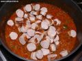 In einer Bratpfanne einen Esslöffel Öl erhitzen und die Bratwürste darin von beiden Seiten hellbraun anbraten. Die Bratwürste herausnehmen, in ein cm breite Scheiben schneiden und auf die Seite stellen.
