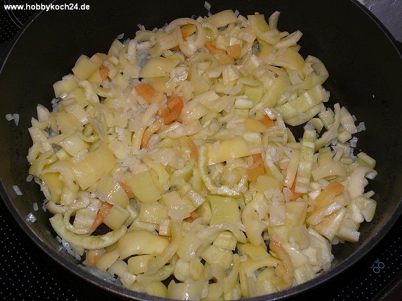Die Paprikastreifen dazugeben und etwa 5 Minuten mit anbraten. Mit Salz und Pfeffer würzen und zugedeckt bei kleiner Hitze garen lassen, bis die Paprika gerade noch leicht bissfest sind. Dies dauerte bei uns ca. 15 Minuten. Dabei gelegentlich wenden und noch einmal gut salzen und pfeffern. Falls die Paprika zu arg anbraten, etwas Wasser dazugeben.