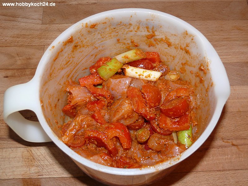 Hähnchenbrust, Paprika, Lauchzwiebeln und Tomaten zusammen mit dem Pesto in eine große Schüssel geben, Knoblauch dazu pressen, und gut miteinander vermischen. Mit Salz, Pfeffer und Paprika würzen. Das Ganze etwa 2 Stunden im Kühlschrank marinieren lassen.