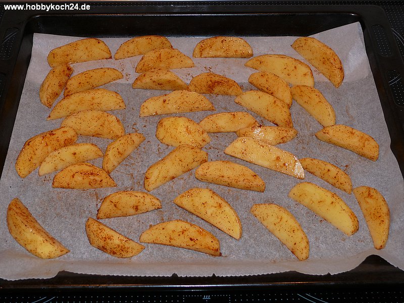 Ein Backblech mit Backpapier auslegen. Die Kartoffelspalten mit Salz, Pfeffer und Paprika würzen und auf dem Backblech verteilen. Im Backofen für 15 Minuten backen.