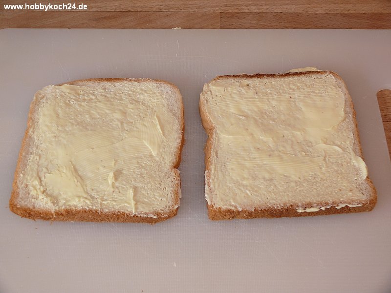 Die Toastscheiben mit Margarine einstreichen. Den Schinken auf die Form des Toastbrotes zuschneiden und darauf legen. Wer große Ananasscheiben hat legt eine Scheibe in die Mitte des Toastbrotes. Bei kleinen Scheiben 3 halbe Scheiben auf dem Schinken verteilen.