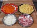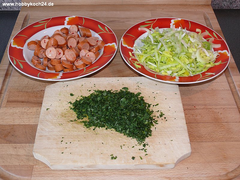 Zwiebel fein würfeln. Möhren schälen und in Scheiben schneiden oder hobeln. Kartoffeln schälen und würfeln. Speck fein würfeln (vorher Schwarte entfernen). Lauch halbieren, waschen und in Streifen schneiden. Petersilie klein hacken. Würstchen in Scheiben schneiden. Gemüsebrühe zubereiten.