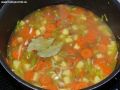 Gemüse, Lorbeerblätter, Nelken und Gemüsebrühe zugeben. Das Gemüse sollte gut mit Brühe bedeckt sein. Ansonsten mit etwas Brühe auffüllen. Alles zusammen bei mittlerer Hitze etwa 30 Minuten kochen lassen.