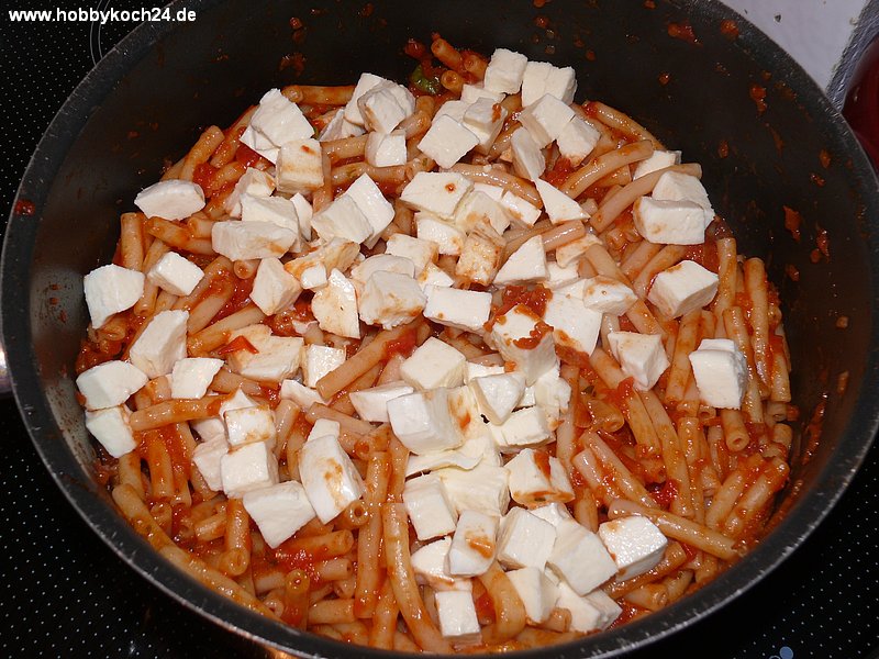 Makkaroni dazugeben und alles gut vermengen. Die Mozzarellawürfel unterheben und bei kleiner Hitze noch etwa 2-3 Minuten schmelzen lassen.