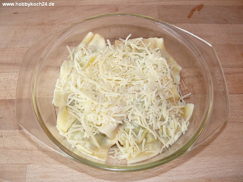 Eine ofenfeste Auflaufform mit Olivenöl einfetten. Nun die Maultaschen darin verteilen und mit geriebenem Käse bestreuen. Die Tomatensoße darüber geben. Es sollte alles gut bedeckt sein.