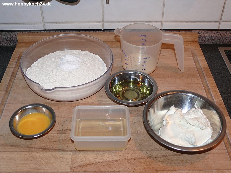 Das Backpulver mit dem Mehl vermischen und in eine mittlere Schüssel sieben. In der Mitte eine Mulde machen und Salz, Quark, Öl, Milch und Eiweiß hinein geben. Mit einem Handrührgerät (Knethaken) den Teig zu einem glatten Teig verarbeiten. Dabei langsam anfangen und die Geschwindigkeit langsam bis zur höchsten Stufe steigern. Den Teig nicht zu lange kneten, sonst klebt er. Am Schluß eventuell noch kurz mit der Hand durchketen.